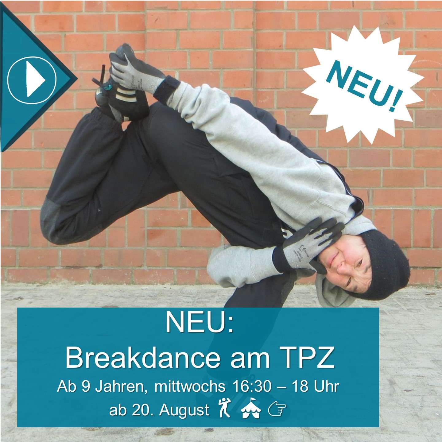 Im Kurs Breakdance kannst du diese energiegeladene Tanzform in ihren Grundlagen kennenlernen. Nach einem körperlichen Warm Up lernst du verschiedene Bestandteile des Breakdance kennen: Die Top-Rocks - Schritte im Stand, die Go-Downs, die einen Übergang zu den Footworks, dem Tanzen aus der Hocke am Boden, schaffen; Freezes - Körperhaltungen, die kurz einfrieren, und Power Moves, die mit viel Energie ausgeführt werden. Die Musik geht dabei von R’n’B über Soul bis Funk und bringt einfach Spaß mit! Vorkenntnisse sind nicht erforderlich.